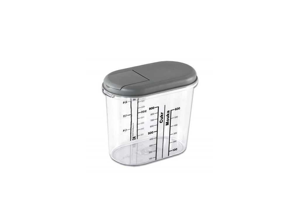 Dóza vhodná na sypké hmoty, transparentní dóza s měrkou.