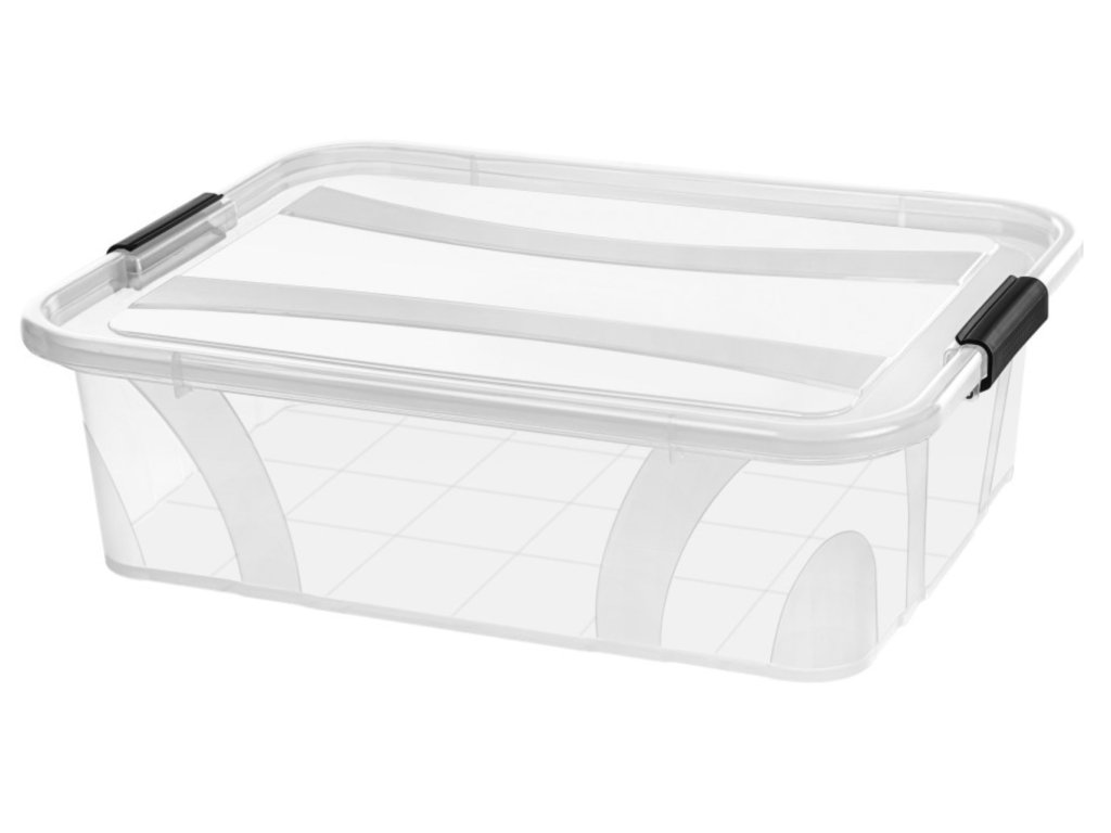Kvalitní plastová čirá dóza s čirým víkem, černé klipy na uzavření víka.