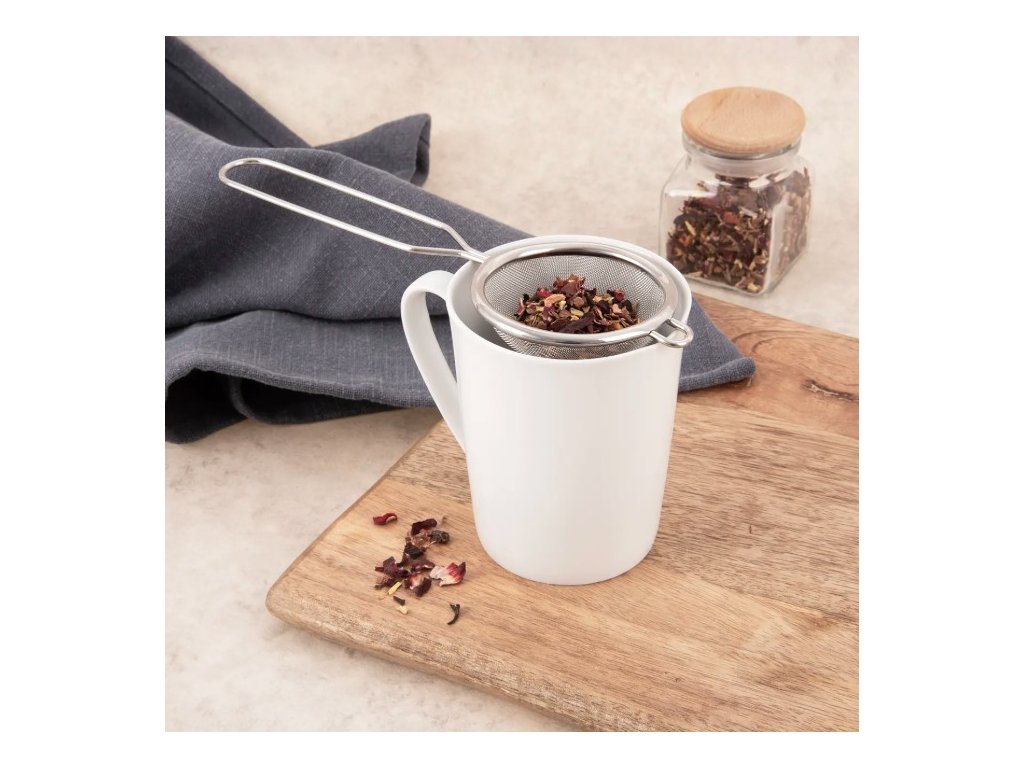 Cedník s velmi jemným sítkem (oka 0.45 x 0.45 mm), s rukojetí a očkem dobře drží na hrnečku.