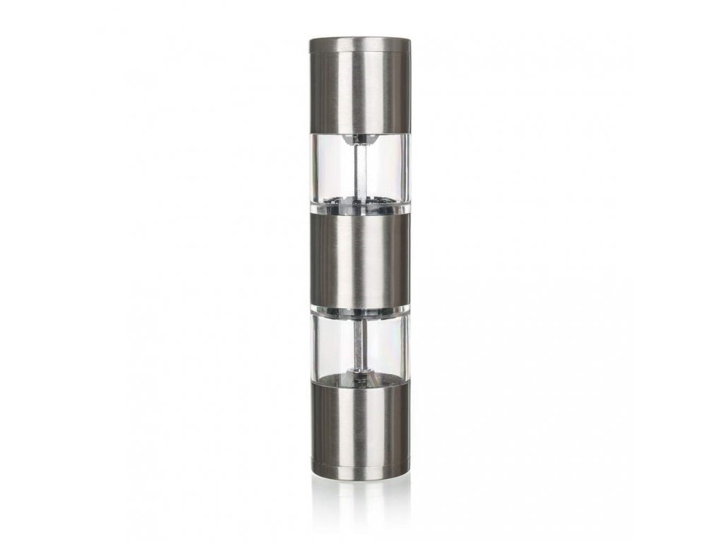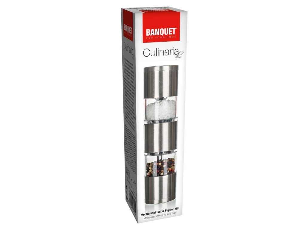 Mechanický mlýnek na sůl a pepř CULINARIA Duo je dodáván v nerezovém provedení, zásobníky jsou akrylové.
