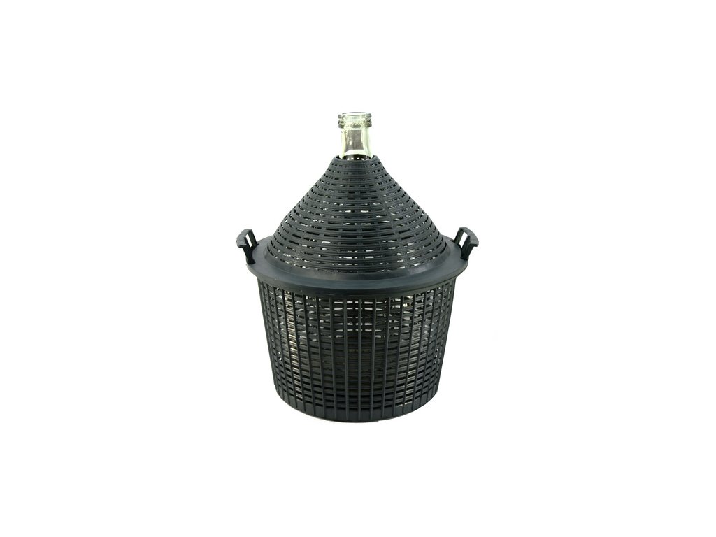 Skleněný demižon v plastovém koši.