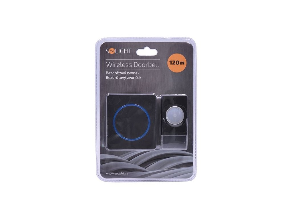 Zvonek bezdrátový 48 tónů, LED, do zásuvky, IP44, černá SOLIGHT