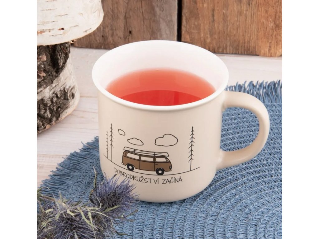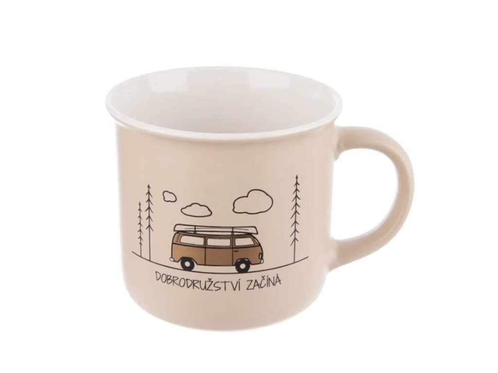 Dekorovaný hrnek DOBRODRUŽSTVÍ ZAČÍNÁ s uchem.