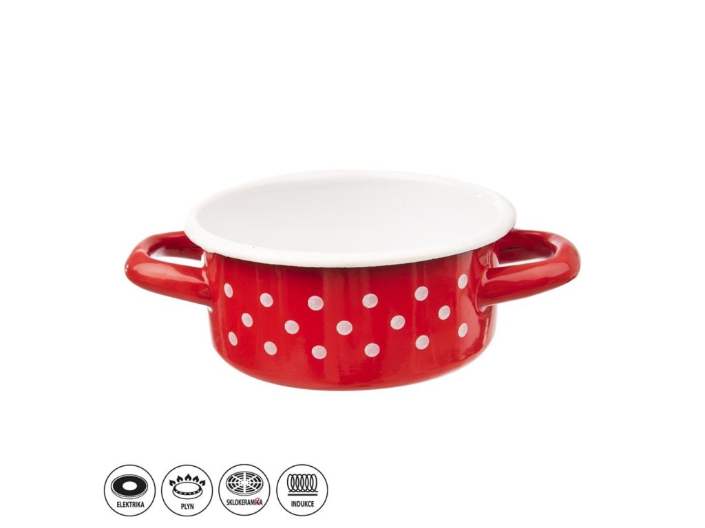 - smaltovaný kastrol v červené barvě s bílými tečkami