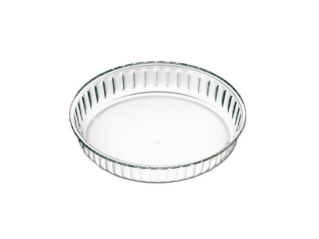 Kulatý tvar s reliefem na okrajích, sklo odolné žáru (-40°C až +300°C), vhodné na zapékání.