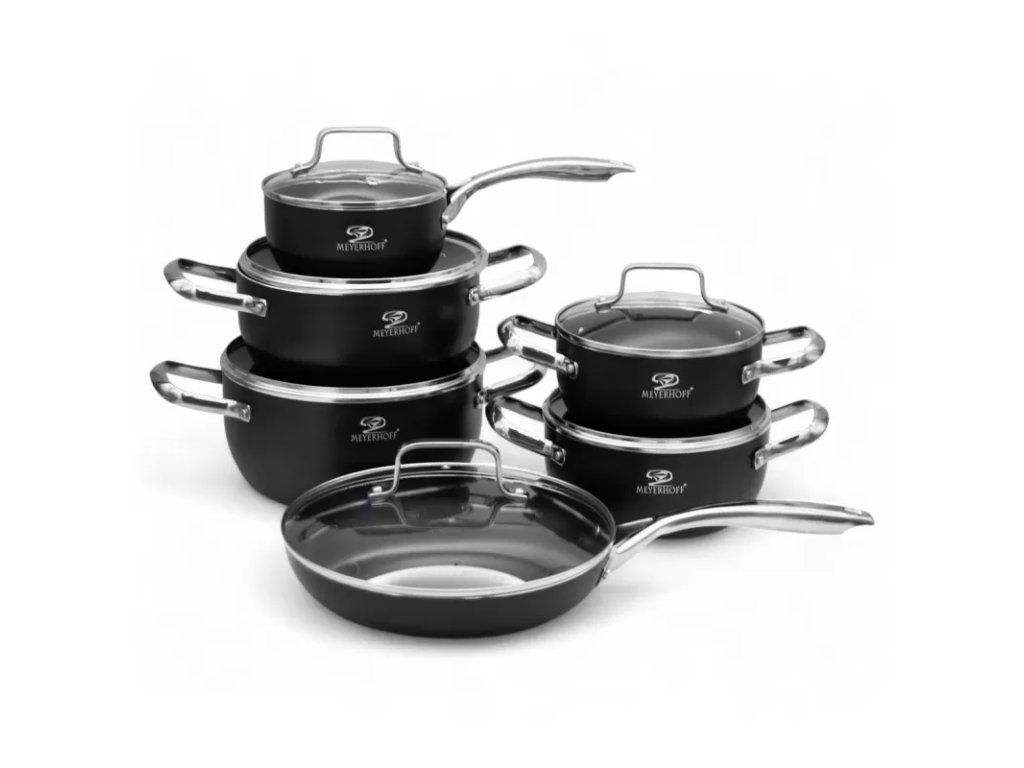 Nádobí, které je součástí sady, je vybaveno praktickými a vhodně profilovanými rukojeťmi a poklicemi.