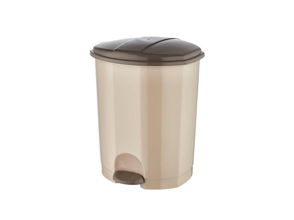 Plastový oválný koš s pedálem, výjimatelná vložka s ručkou, která současně slouží jako manžeta pro uchycení odpadkového pytle.