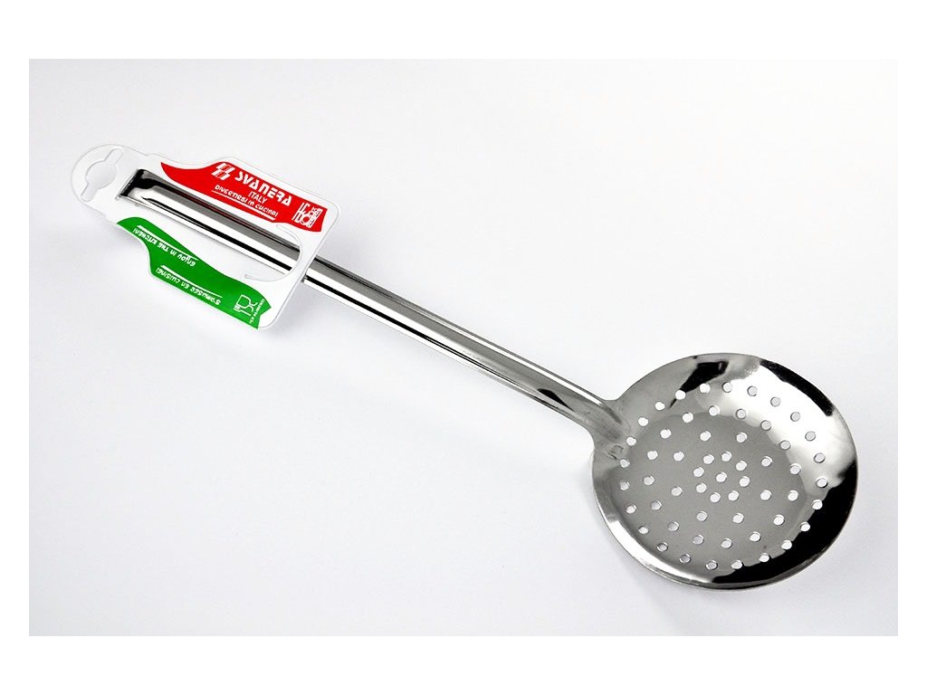 Kvalitní celonerezová cedící lžíce s háčkem na zavěšení, délka 35.5 cm, průměr hlavy 11 cm, vhodná do myčky nádobí.