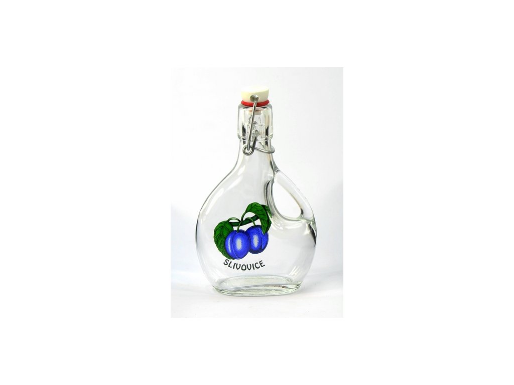 Láhev sklenice s ouškem Bocksbeutel s dekorem švestka slivovice je ideální na destiláty.
