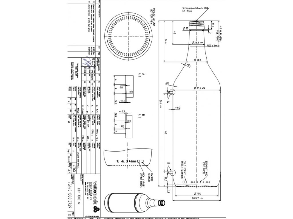 Celkový objem 1015 ml, užitný objem 1000 ml, průměr sklenice 85.7 mm, výška sklenice 300 mm, plnící výška 47 mm.