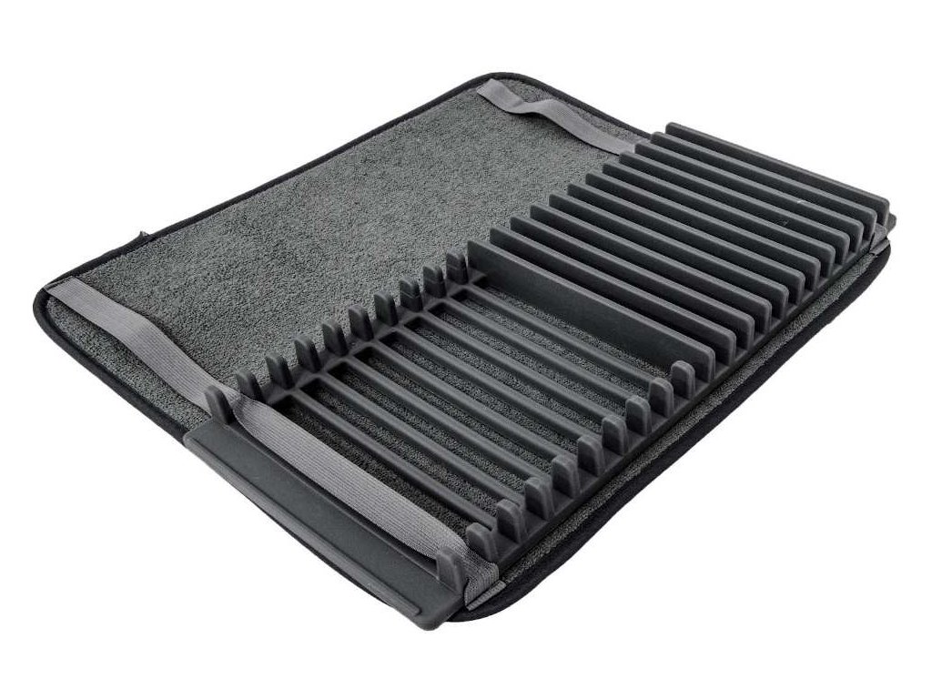 Praktický mobilní skladný odkapávač na nádobí se stojanem na talíře a odkapávací mikrovláknovou podložkou na hrnky a jiné nádobí.