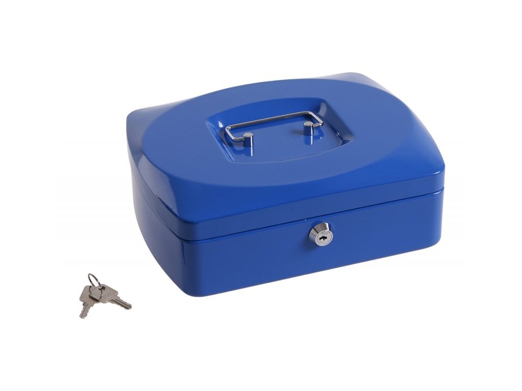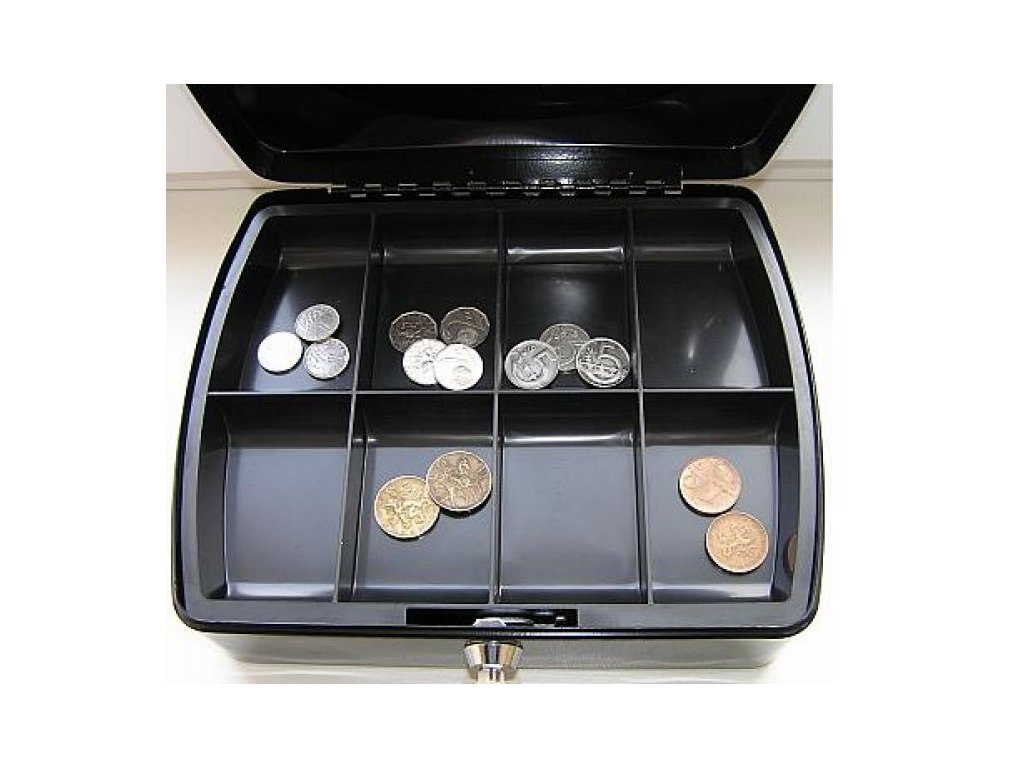 Ocelová schránka na peníze s plastovým pořadačem na bankovky a kovové mince a úložným prostorem pod pořadačem.