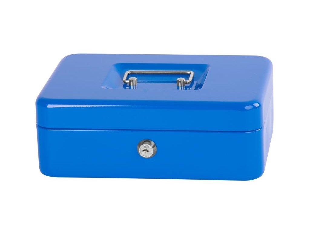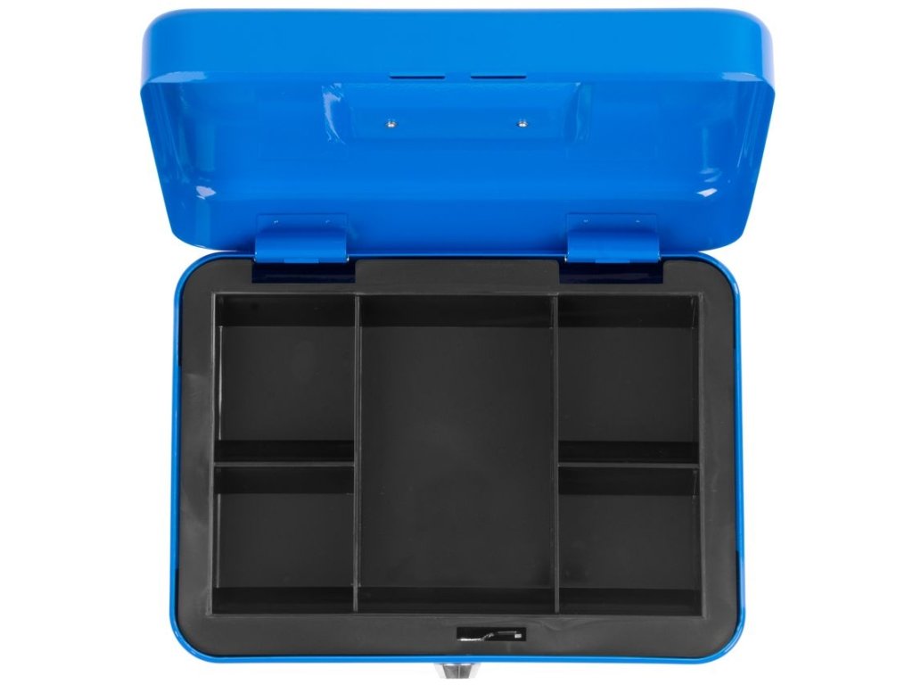 Ocelová schránka na peníze s plastovým pořadačem na kovové mince a úložným prostorem pod pořadačem.