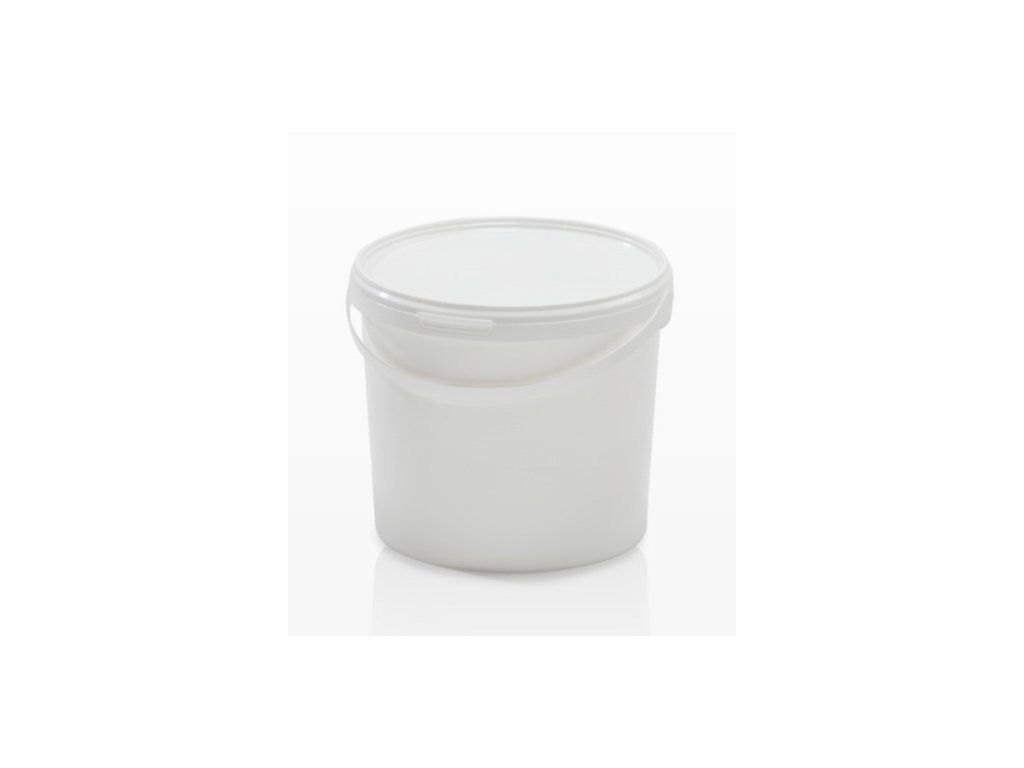 Plastový bílý kbelík s víkem s pojistkou a uchem pro přenášení.