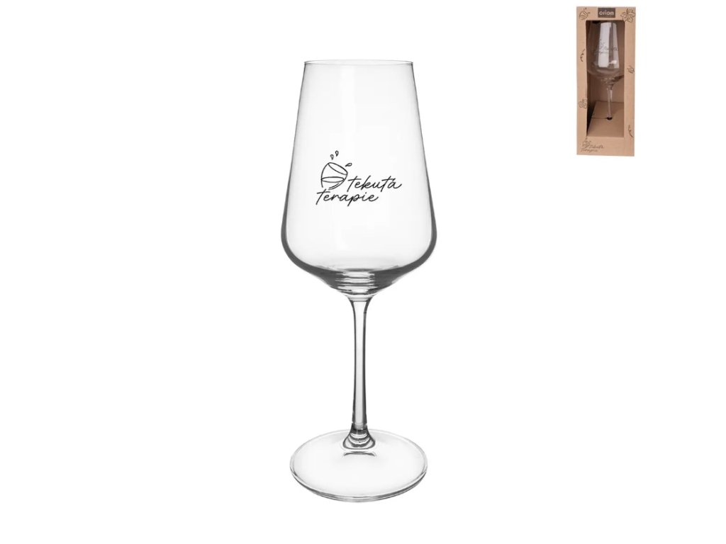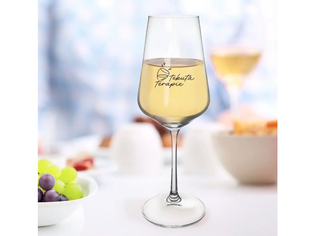 Elegantní sklenice na nožce na víno s dekorem TEKUTÁ TERAPIE je vyrobena z kvalitního českého skla.
